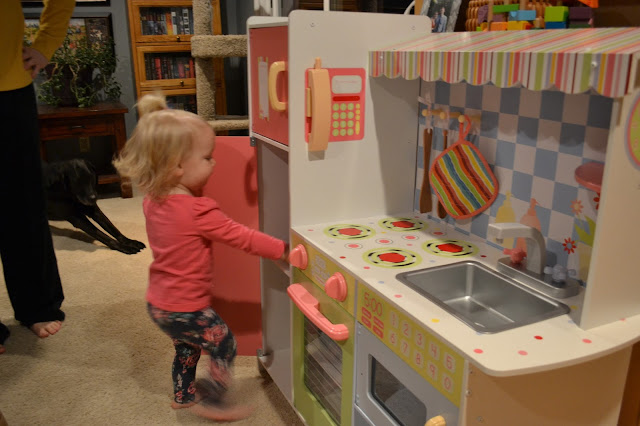 Uncle Bryan and Auntie Deedee got her a tea set, which is also a big hit in the Naylor house. Uncle Mike and Auntie Kelly got her the plastic food for her kitchen. She has so much good play stuff!